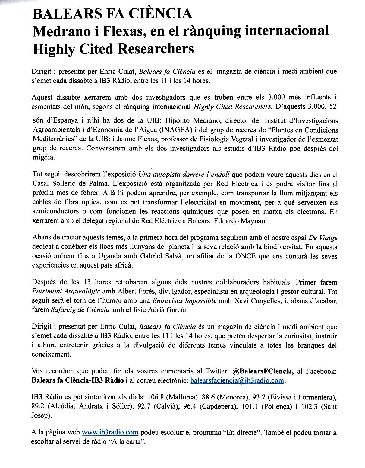 Medrano i Flexas en el rànquing internacional Highly Cited Researchers